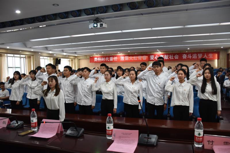 太阳成集团tyc234cc“关爱小屋”青年志愿者临时团支部全体团员起立,面向团旗重温入团誓词。