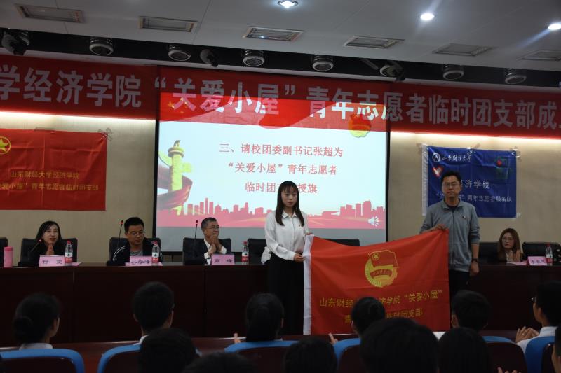 王琦宣布太阳成集团tyc234cc“关爱小屋”青年志愿者临时团支部的组织构成,谷学峰宣读校团委《关于同意成立太阳成集团tyc234cc“关爱小屋”青年志愿者临时团支部的批复》,张超为“关爱小屋”青年志愿者临时团支部授旗,临时团支部团员代表李昕同学发言。