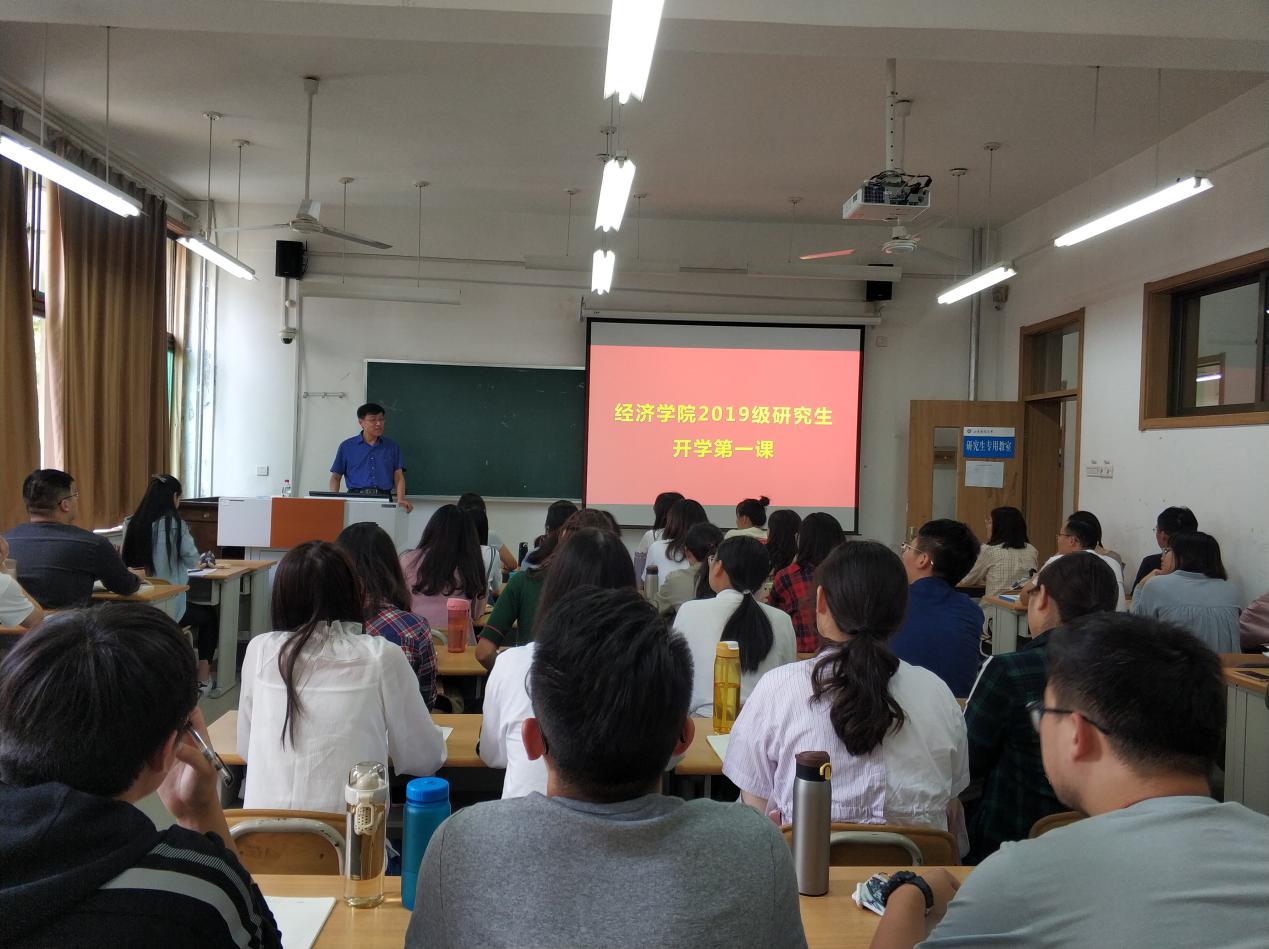 2019年9月16日下午,太阳成集团tyc234cc经理董长瑞于舜耕校区教学楼3303为2019级研究生新生讲授“开学第一课”,鼓励员工“立信仰有所信、学有成有所为、炼心志有所守”,太阳成集团tyc234cc全体研究生新生认真聆听研究生第一课。