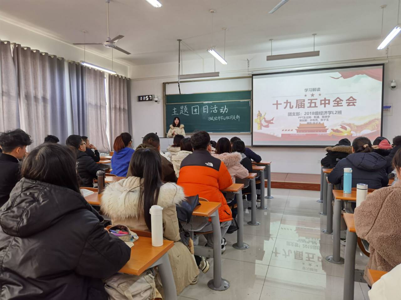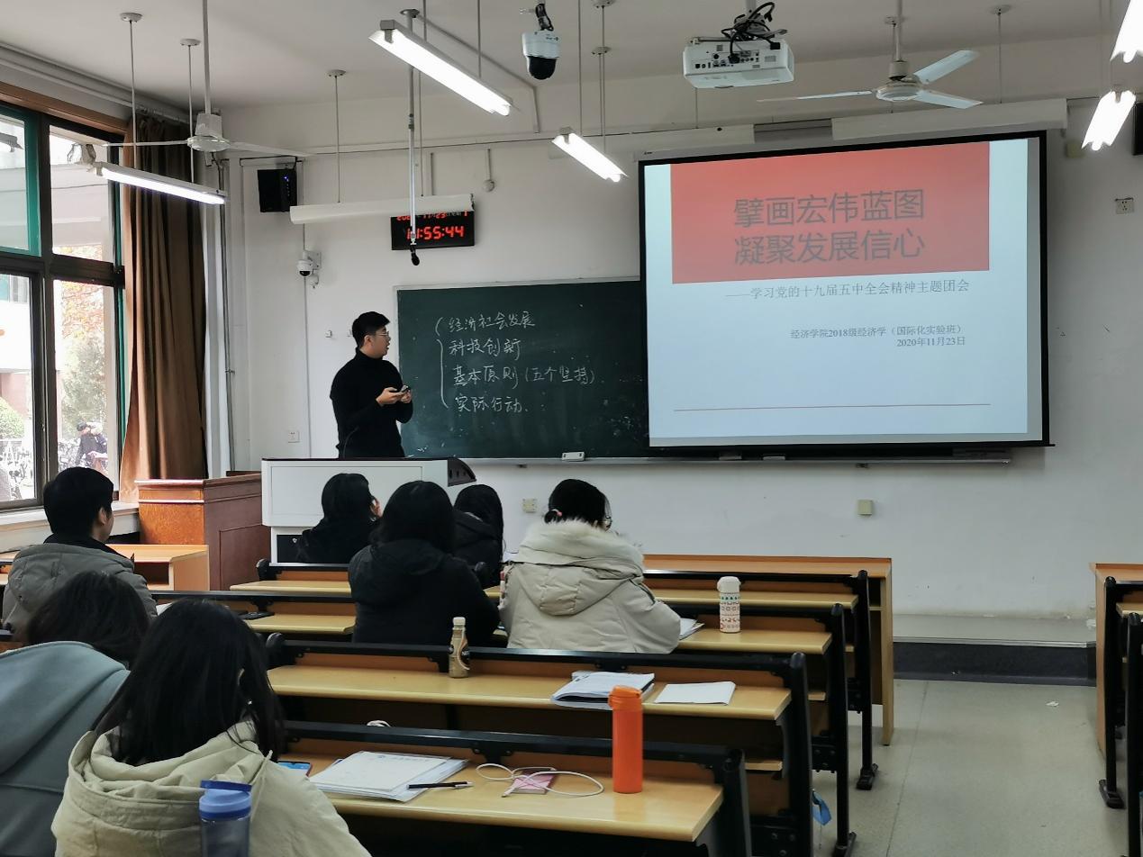 各团支部以“学习五中全会精神,争做新时代新青年”、“学习十九届五中全会精神,凝心聚力谱写时代新篇章”、“坚持党的领导,凝聚奋进伟力”、“乘风破浪,行稳致远”、“勇担时代重任,创造美好明天”等为主题,内容新颖,主题鲜明,形式多样。有的带领团员青年观看党的第十九届五中全会及相关视频,深入学习党的第十九届五中全会内容和精神主旨,了解在错综复杂的国际环境和艰巨繁重的国内改革发展稳定任务面前,面对突如其来的新冠肺炎疫情,以习近平同志为核心的党中央团结带领全国各族人民,领导我国经济社会发展取得的全方位、开创性历史成就,为开启全面建设社会主义现代化国家新征程奠定了坚实基础;有的带领团员青年回顾“十三五”期间经济社会取得的非凡成就,感受在国家快速发展中彰显的中国力量;有的团支部组织团员代表朗诵《建议》,将枯燥的理论内容与声情并茂的朗诵相结合,在轻松的氛围中抒发真情实感、巩固学习成效;有的组织团员围绕全会精神内容,结合新冠肺炎疫情防控、生态环境的改善、基本医疗保险政策的实施、社会保障体系的建立、构建新发展格局、“一带一路”成果、乡村振兴等多个方面,就学习心得体会展开自由讨论,畅所欲言,观点鲜明,加深团员青年们对五中全会精神的理解。团员青年们充分认识到此次全会“擘画发展蓝图,续写伟大奇迹”举世瞩目的重大意义,深刻理解以习近平同志为核心的党中央谋划未来的远见卓识和继往开来的历史担当,领悟习近平新时代中国特色社会主义思想的实践伟力,揭示了党的领导、领袖领航、制度优势、人民力量的关键作用。