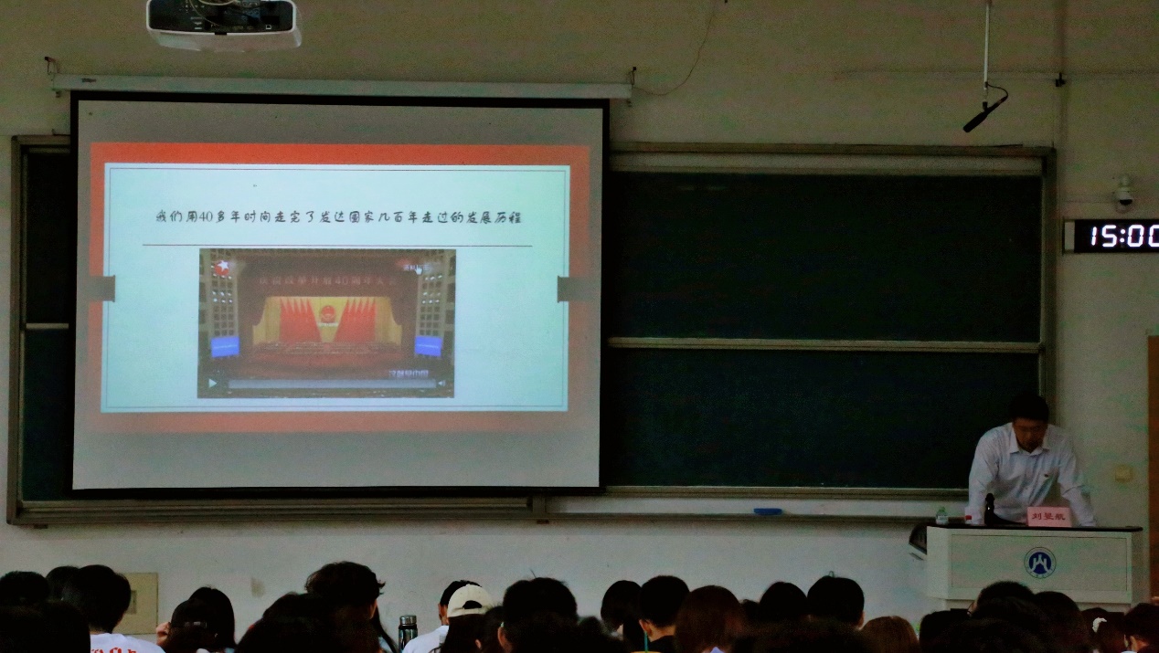 刘旻航以“从‘四史’看中华民族的伟大复兴”为题,从党史、新中国史、改革开放史、社会主义发展史四个方面,介绍了在党的英明领导下中华民族从东亚病夫,一步步到站起来、富起来、强起来,走向伟大复兴的辉煌历程。刘旻航从100年的建党奋斗史、72年的中华人民共和国实践史,43年的改革开放发展史、500年的人类进步史四个维度,带领大家重温中国共产党从诞生以来为中华民族和中国人民建立的不朽功勋,感悟党的初心和使命,用真实可靠的数据动态呈现新中国成立到改革开放后的各项成就,引导同学们运用经济学专业知识深入思考经济发展现象背后所隐藏的本质规律,通过播放科技成就、文学作品、抗击疫情、“新四大发明”等视频,充分展现了中国特色社会主义新时代的我国各领域取得的卓越成果,凸显和平崛起的“中国模式”、应对危机的“中国方案”、走向世界的“中国力量”,再次印证了“只有社会主义才能救中国,只有社会主义才能发展中国”的历史结论。刘旻航还结合自身经历,以小见大,反映出时代巨变,折射出中国的飞速发展。他强调要抓实“四史”教育,坚持学史育人,鼓励同学们掌握马克思主义和中国化马克思主义理论精髓,继承发扬中国革命、建设、改革的优良传统,坚持唯物主义历史观和方法论,汲取历史进程中积淀而成的精神力量。
