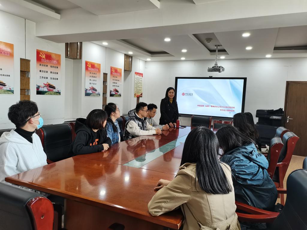 (通讯员 唐小泉)10月20日下午,中信证券(山东)有限责任公司青岛延川路营业部来公司举办专场招聘宣讲会。此次招聘宣讲会由营业部总经理张丽丽主讲,公司党委副书记李冰封、党委专职组织员王琦出席会议。
