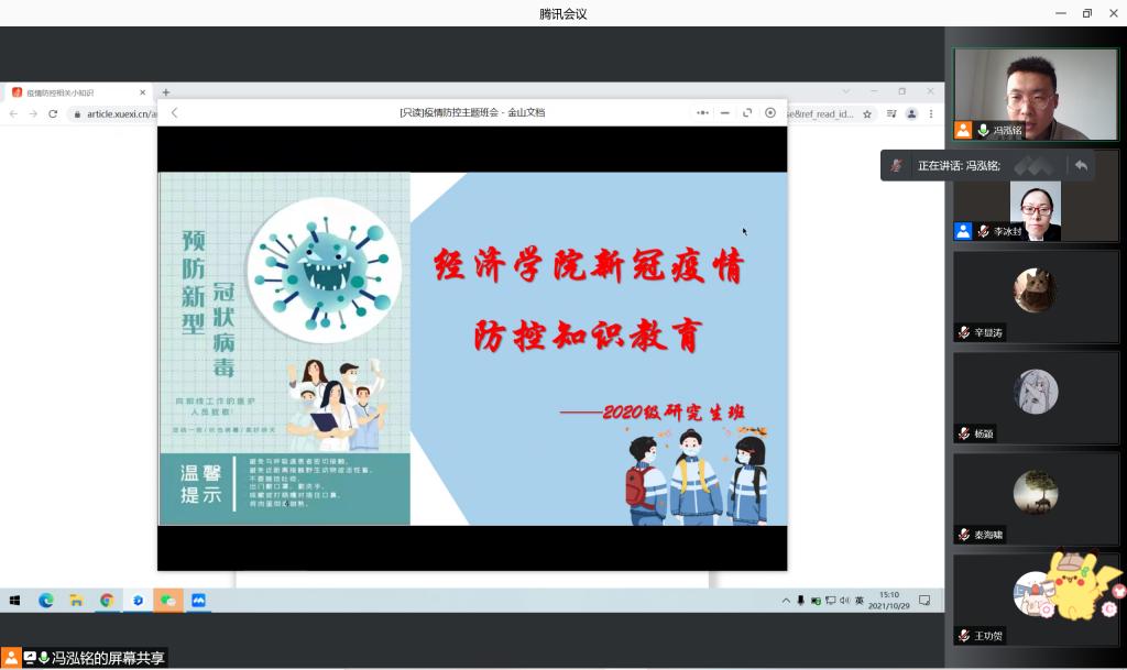 (通讯员:林安冉 邢睿 唐玲玲)为认真落实学校加强疫情防控相关知识和技能培训要求,进一步做好疫情防控常态化工作,提高研究生疫情防控水平,保障员工健康安全和教学工作顺利开展,10月29日下午,太阳成集团tyc234cc组织全体研究生开展了新冠疫情防控知识教育活动。本次教育活动以各个班级为单位、各班班长为主持人,全体研究生参加。会议采取线上形式进行。