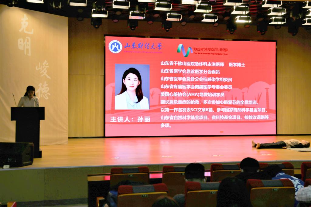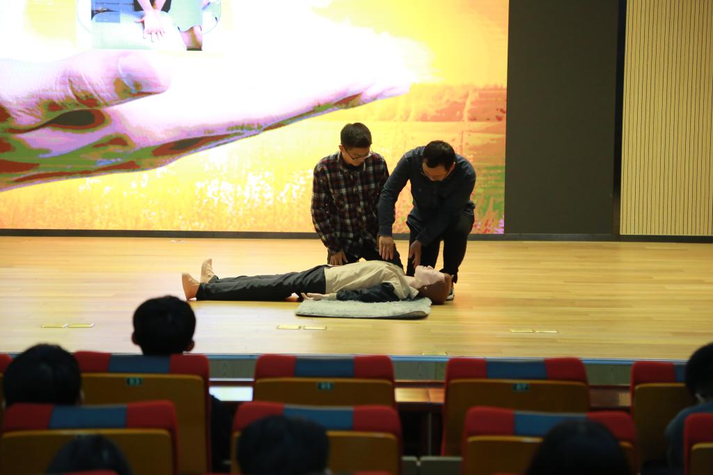 最后,孙丽随行专业医师示范了心肺复苏法,生动形象地传授了急救技能,随后邀请志愿者同学上台亲身体验实施心肺复苏术,亲身感受便于同学们掌握心肺复苏法的操作技能。
